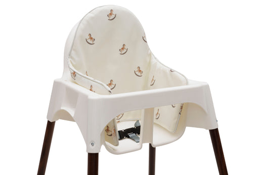 Neu in unserem Sortiment: Unsere Hochstuhlkissen, sie passen perfekt in den IKEA Hochstuhl. Diese Kissen haben keinen Sitz an der Unterseite, sondern fungieren als zusätzliche Schicht im Stuhl, um den Kinderrücken zu unterstützen. Die erhöhten Armlehnen sorgen dafür, dass dein Kind aufrecht sitzt, und die Schlaufen an diesem Kissen sorgen dafür, dass es sicher sitzt. Das Material ist wasserabweisend und kann leicht mit einem feuchten Tuch abgewischt werden. Der Nostalgic Ride Print mit den niedlichen Schaukelpferden in der Farbe Oatmeal ist super schön!