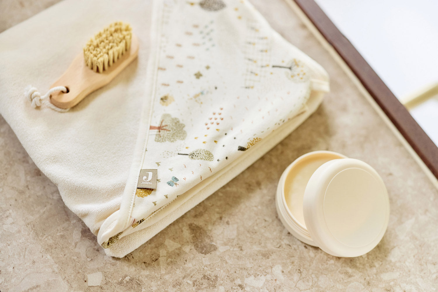 This soft bath cape is perfect for drying your little one after bath time. The outer layer is made of soft jersey with a cute all-over Tiny Park print, while the inside is lined with ultra-soft oatmeal-colored terry cloth for added comfort. The 75x75 cm size makes it perfect for wrapping up your baby after a warm bath!