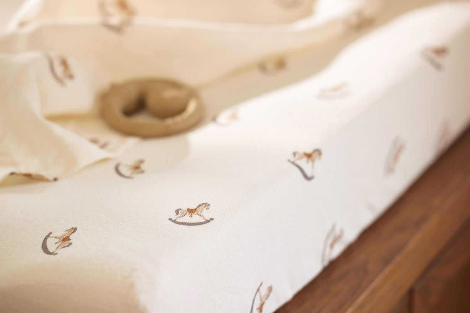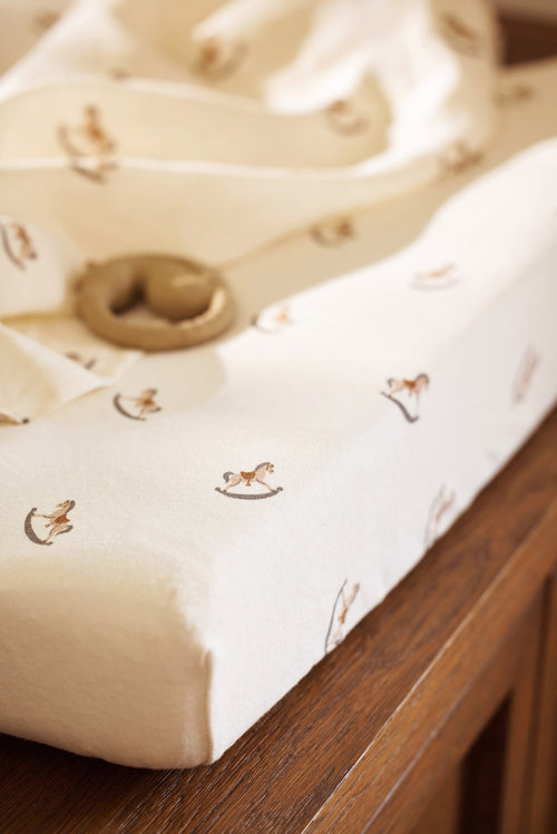Opt for the Nostalgic Ride theme and upgrade your changing mat with this adorable changing mat cover! Made of soft fabric in the colour Oatmeal and decorated with cute rocking horses, this cover is truly an asset. The cover stays securely around the changing mat thanks to the elastic band at the back. You will find that you will never have enough changing mat covers. You change the changing mat cover at least once a day and often several times a day.