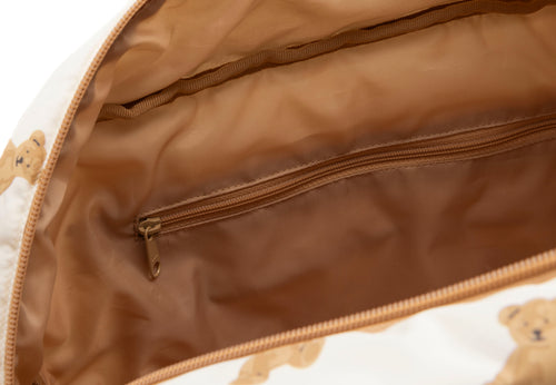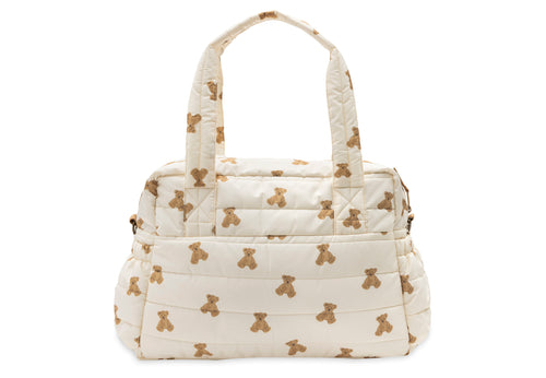 This trendy diaper bag from the Mini Teddy Bear theme combines a cute look with plenty of functionality. The bag is spacious, providing enough room for all the essentials you need on the go. The front features convenient pockets with Velcro closures, including a matching changing pad that’s always within reach. Thanks to the bionic finish, the bag is water-repellent, making it perfect for any weather. You can carry it easily by hand or with the adjustable shoulder strap. Tip: pair the bag with our stroller hooks for even more convenience while walking.