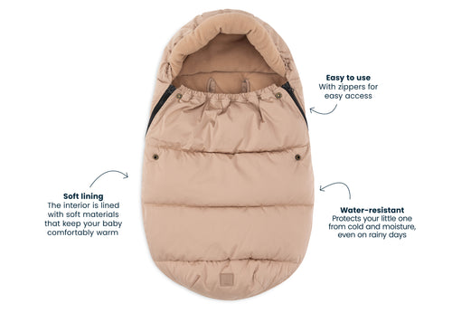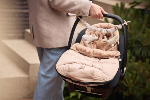A footmuff is a true asset. You can easily place your baby in the footmuff by completely unzipping the bag first. You can also easily remove your baby from the car seat by unzipping the footmuff completely. In short: an incredibly practical comfort bag for your baby. The footmuff has openings in the back to make attaching belts very easy. It is a universal footmuff for the Maxi Cosi and any other brand of category 0 car seat with three or five-point harness. You can also use this comfort bag in the pram. So your baby will be wrapped up and warm for the walk in no time. This Puffed black footmuff is totally on-trend and matches our other items in the Puffed collection. Think of pouches, diaper bags and backpacks for your mini(s)! Mega cute. This footmuff does not have a TOG rating, as it is designed to keep your little one warm on the go and not to be used as a sleeping bag.