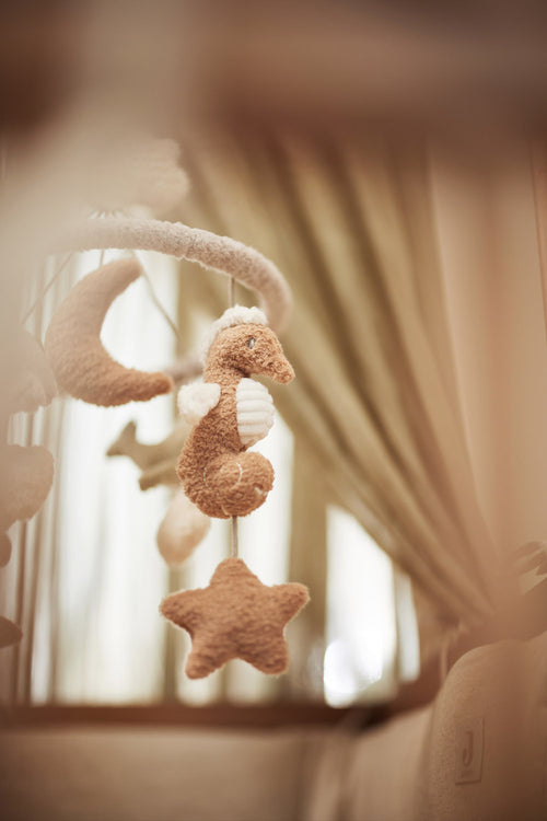 Show your little one the beautiful world of the ocean with our Deep Sea mobile hanger. This enchanting hanger is perfect to hang above the playpen and let your baby enjoy a sea of adventures. The mobile has a lot of ocean friends on it, such as whales, turtles and seahorses, together with playful shells, stars and moons. The various fabrics, including soft terry in the colours biscuit, olive green and oatmeal, will give your baby a wonderful sensory experience. Bring the deep sea straight to the babyroom and let your child be amazed by the underwater world with this beautiful mobile hanger.