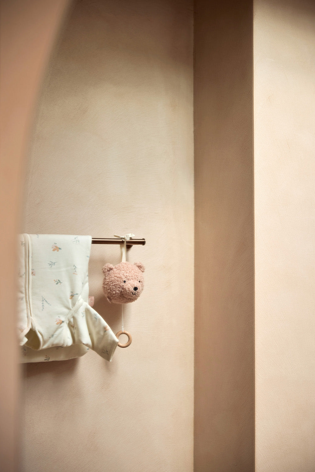 This sweet little bear will sing for your little one! This cute musical hanger plays the song ‘’you are my sunshine‘’ when you pull the string. This can have a soothing effect on your baby. You match this musical hanger well with the Teddy Bear cuddly toy or dummy cloth, for example. Tip: play the music regularly close to your pregnant belly and you will see that it is familiar and soothing for your little one when they have just been born. This musical hanger therefore makes a nice pregnancy gift. It will also be popular as a maternity present. Will you pick the colour Olive Green or Wild Rose?