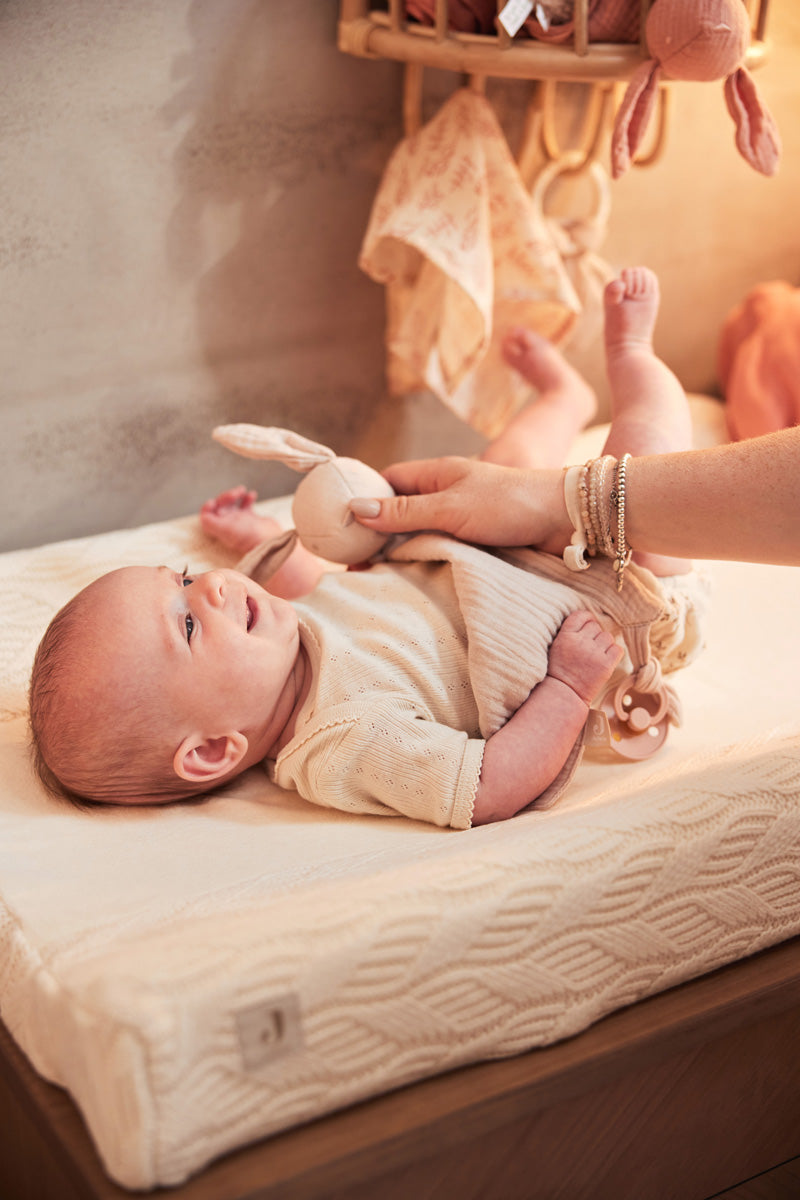 This cute pacifier cloth, in the shape of a cute bunny, is made of extra soft wrinkled muslin. The cloth is not only a cuddly friend for your baby, but also a practical accessory to keep the pacifier close by. Let your little one cuddle this soft bunny for comfort, always close. Shop this adorable pacifier cloth in olive green, moonstone and wild rose.