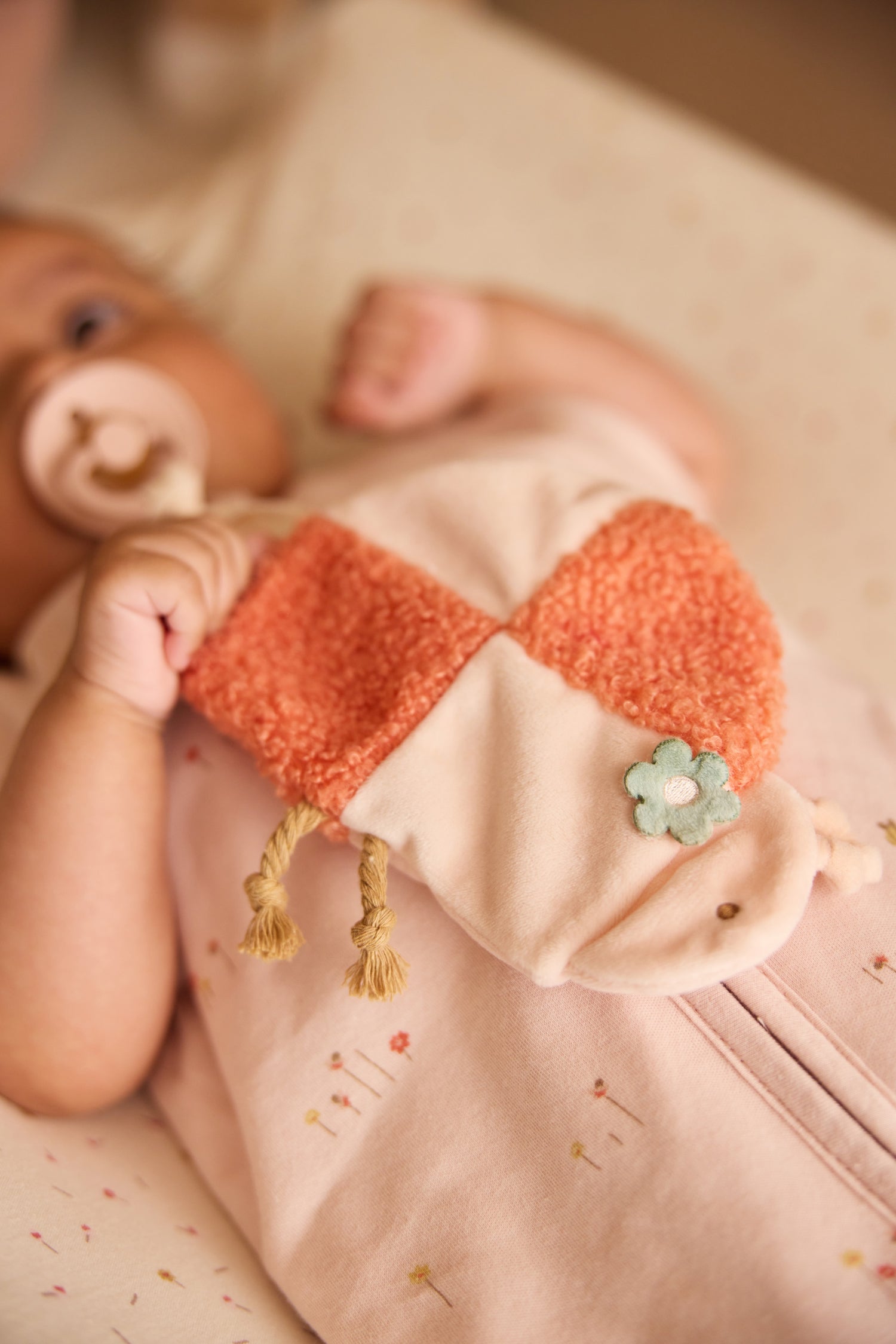Discover this super-soft pacifier cloth from the Pretty Picnic theme, shaped like an adorable ladybug. The body is made from soft bouclé and velvet, giving it a wonderfully cuddly feel. Its small size makes it easy to take along anywhere — perfect for little hands to hold or play with. Thanks to the handy loop, you can easily attach a pacifier, so this cute little friend is always close by.