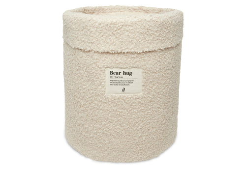 p>Corbeille pratique en tissu Bouclé doux et moelleux pour ranger de petites affaires. La corbeille mesure 14 cm de haut et a un diamètre de 18 cm. Sur le devant de la corbeille, on retrouve le joli logo « bear-hug ». Cette corbeille est super pratique sur la commode pour les produits de soins tels qu'un ensemble de manucure, une brosse et un thermomètre. C'est en même temps un accessoire amusant qui donne à la chambre d'enfant une touche d'ambiance supplémentaire. Cette corbeille de rangement permet de garder les tiroirs de votre commode bien rangés. Une corbeille pour les chaussettes, les produits de soin et les pantoufles. De plus, c'est beau sur la commode ! Également pratique dans le salon pour les petits jouets. Cette corbeille peut également être combinée avec le grand panier de rangement Bouclé.