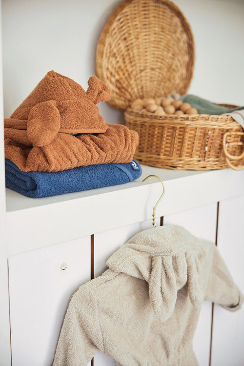Hoe leuk is dit badjasje? De badjas is perfect om te gebruiken na het badderen, douchen of zwemmen. De zachte badstof neemt gemakkelijk water op en houdt daarmee jouw kleintje lekker warm. De vrolijke capuchon met oren droogt gemakkelijk de haartjes. Het badjasje is ook handig om mee te nemen op vakantie of mee naar een logeerpartijtje. Het badjasje heeft een handig drukknoopje om hem dicht te houden bij het dragen, elastiek in het rugpand voor de perfecte pasvorm en de ceintuur zit aan het badjasje vast zodat je hem niet kan verliezen. De badjas is verkrijgbaar in de kleuren: Ash Green, Sea Green, Biscuit, Caramel, Ivory, Jeans Blue, Nougat, Wild Rose, Pale Pink en Biscuit. Bekijk ook onze gestreepte badjasjes!